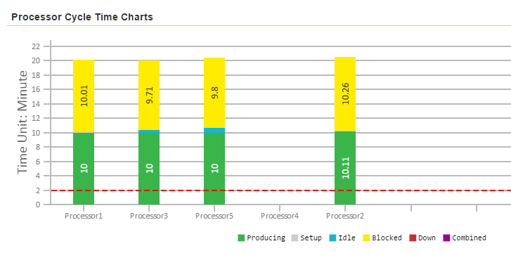 加工周期時(shí)間表可以直觀地看到模型的仿真數(shù)據(jù)。紅色虛線是模擬中報(bào)告的節(jié)拍時(shí)間。